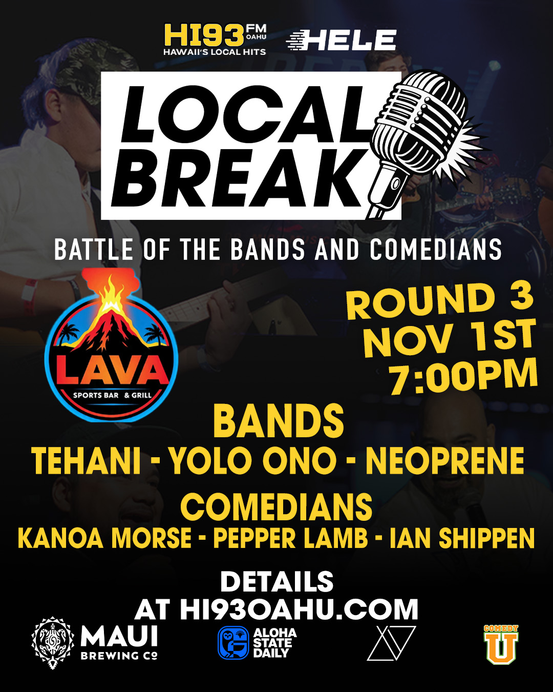 Get ready for an unforgettable night of local talent at the HI93 Local Break: Battle of the Bands & Comedians – Round 3 at Lava Sports Bar & Grill! Watch Hawaii’s rising stars take the stage to showcase their musical skills and comedy chops in an epic showdown of sound and laughter. Come support your favorite local artists, enjoy great vibes, and be part of the energy that makes Hawaii’s creative scene shine. Don’t miss your chance to catch the next big name before they break out—get your tickets now!